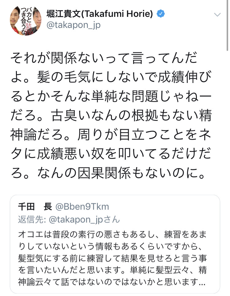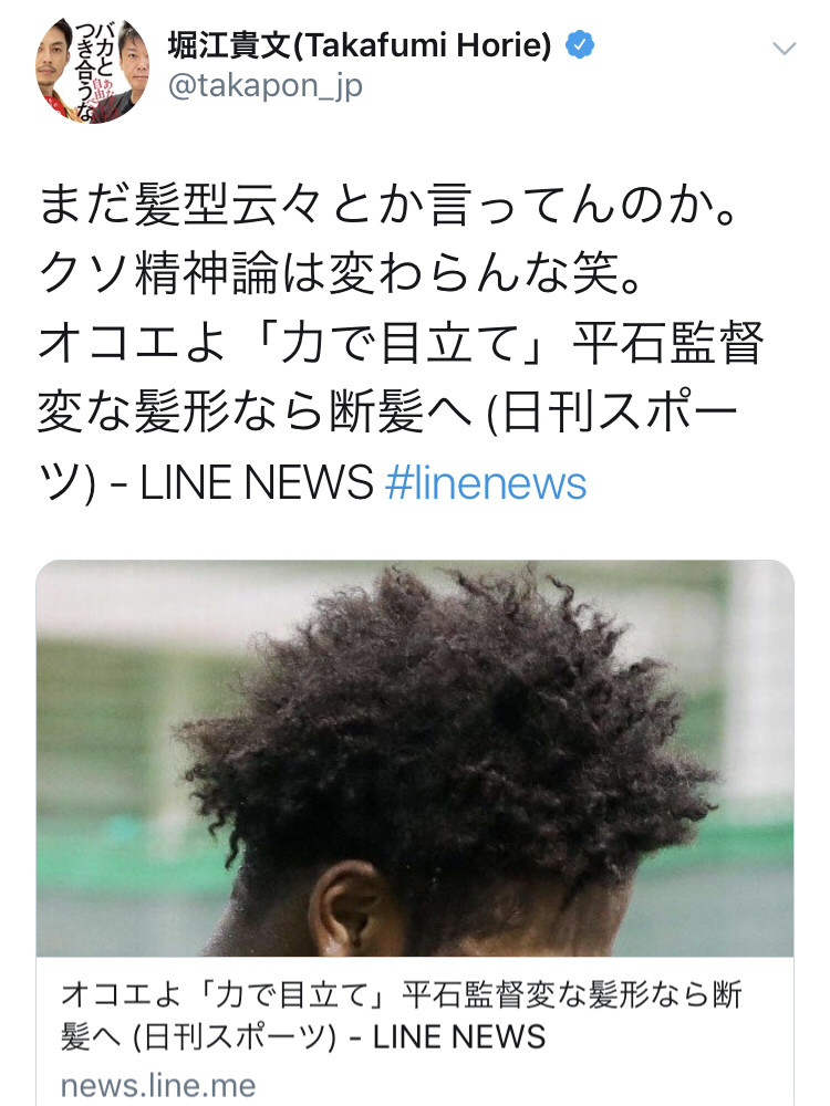 堀江貴文さん、オコエの頭髪の話題についてツイート 2019年01月01日 カテゴリ:4・9オコエ瑠偉堀江貴文 mixiチェック 1: 風吹けば狗鷲 2019/01/01(火) 02:50:57.04 ID:Q9NpjQcxa 引用元: ・堀江貴文、オコエを擁護「まだ髪型云々とか言ってんのか。クソ精神論は変わらんな笑。」 【堀江貴文さん、オコエの頭髪の話題についてツイート】の続きを読む タグ :#頭髪#Tweet